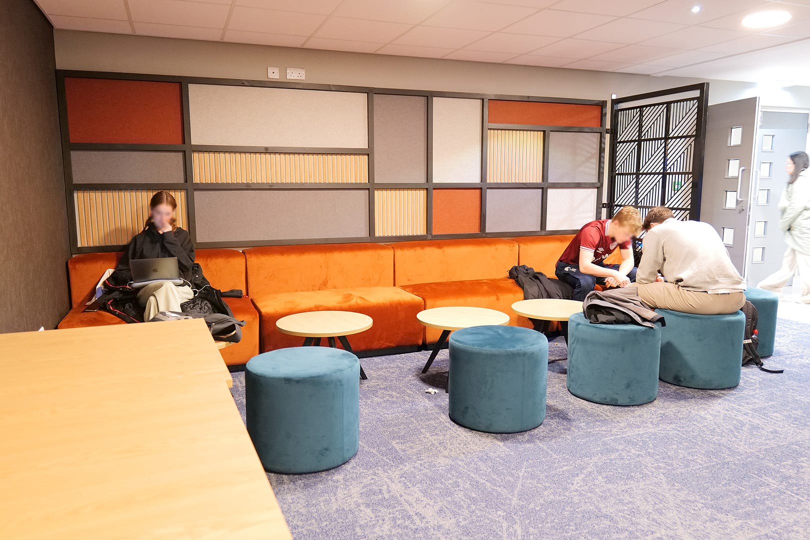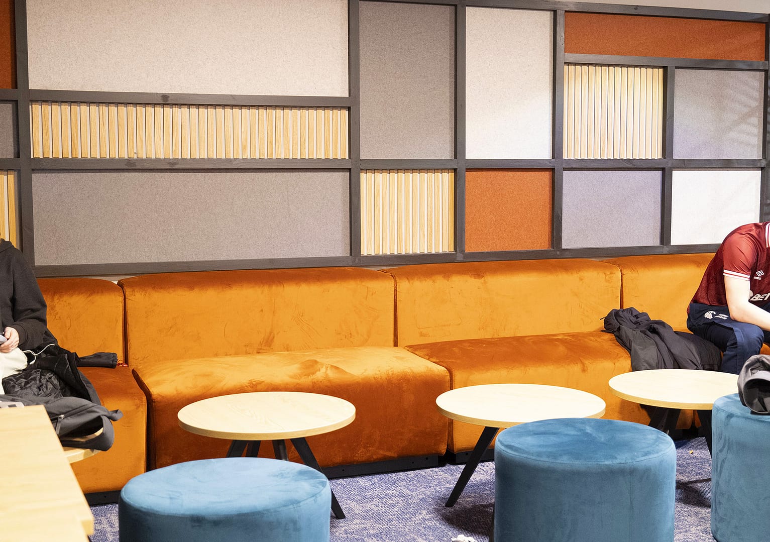 We also created a unique feature wall behing a seating area with acoustic fabric and slatted panels complete with an ERW mild steel screen to complete the look and create a divide with the adjoining area.