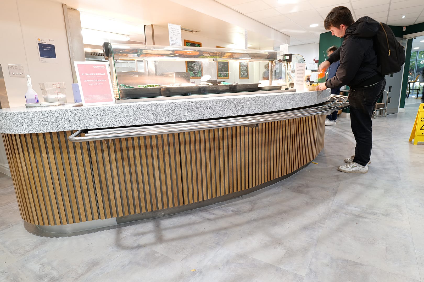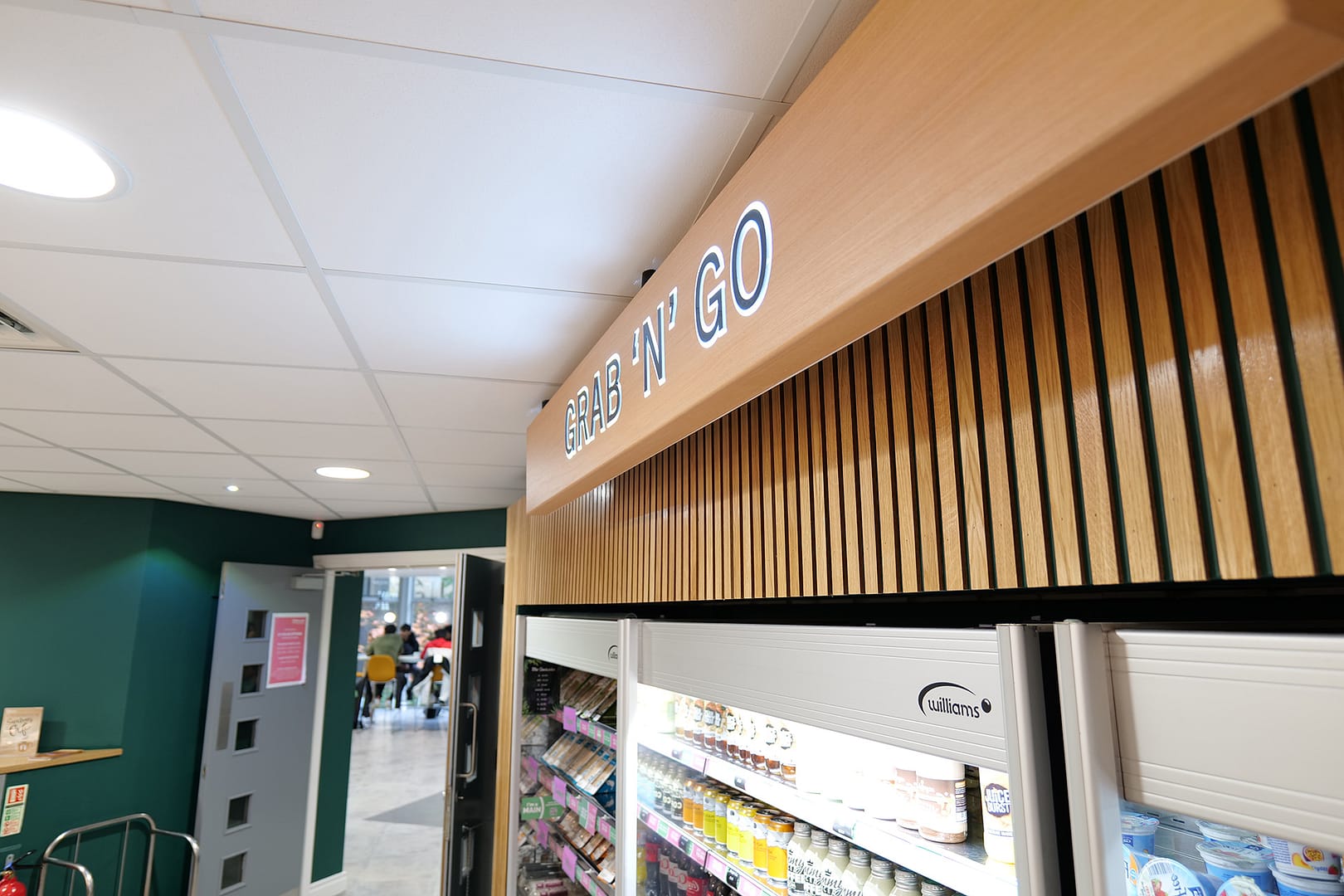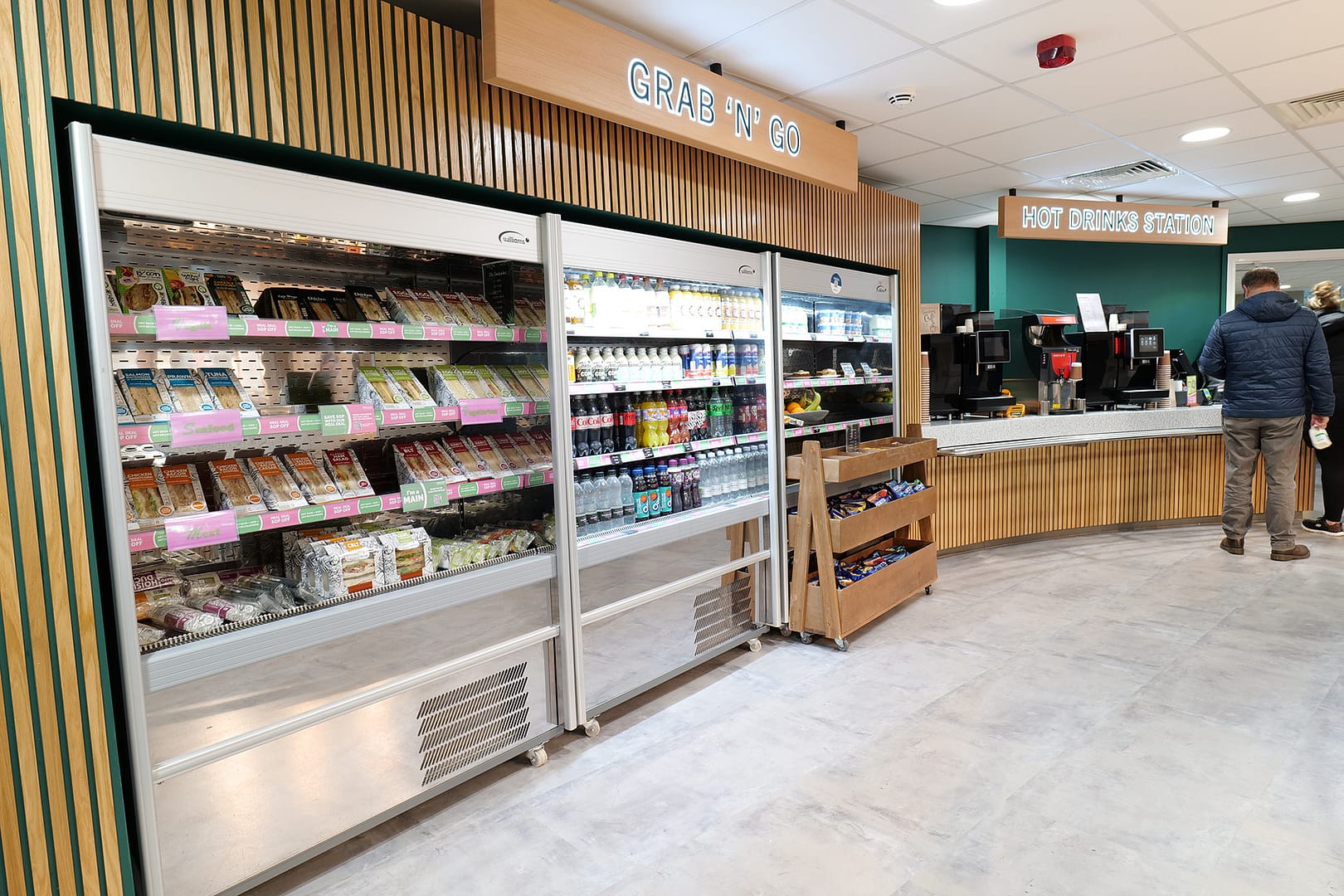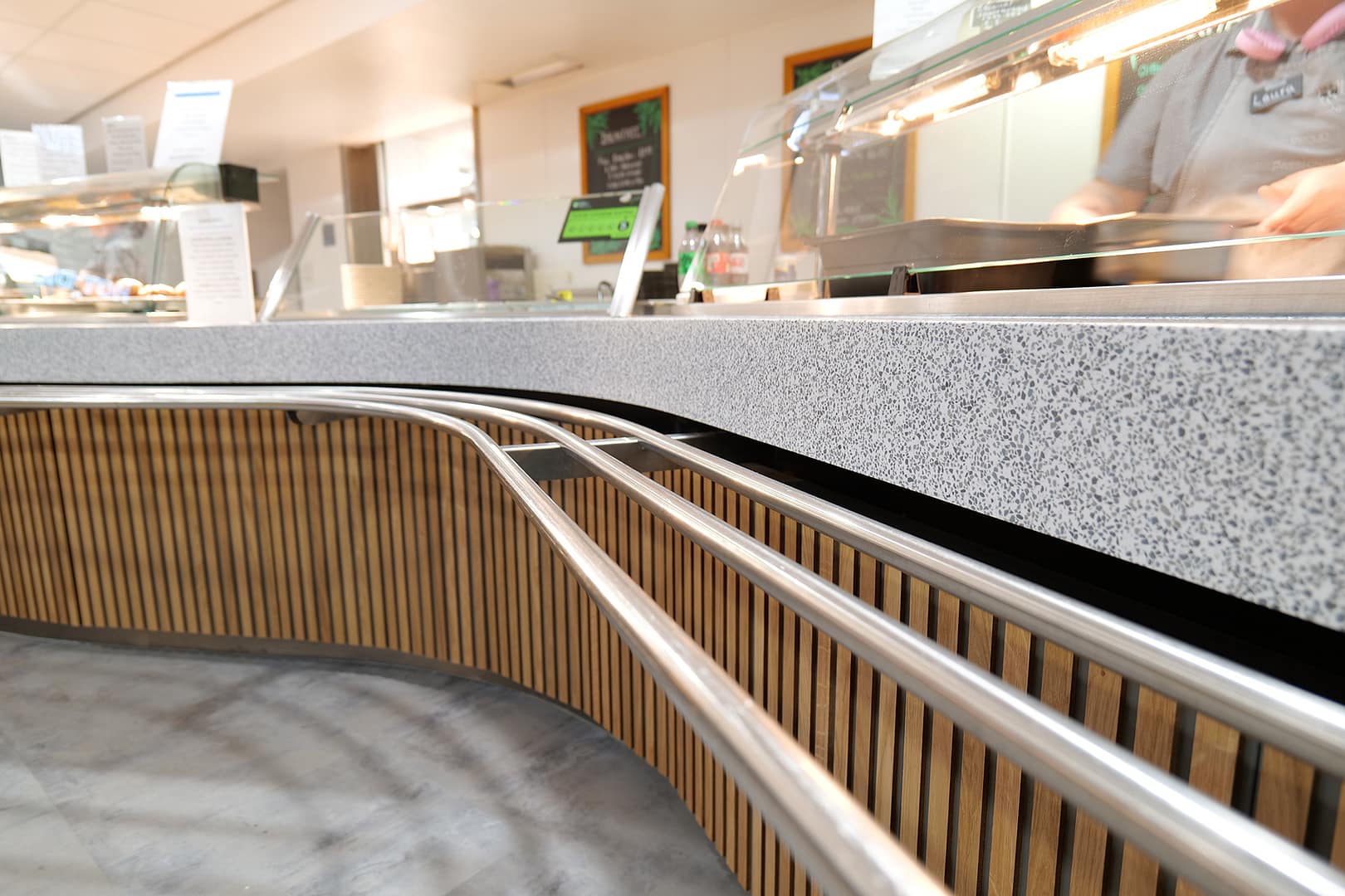 Several other areas such as a fridge “grab and go” section, condiment and cleaning areas had hand-made surrounds comprising individual slats of stained and varnished wood which were painstakingly installed by hand.
