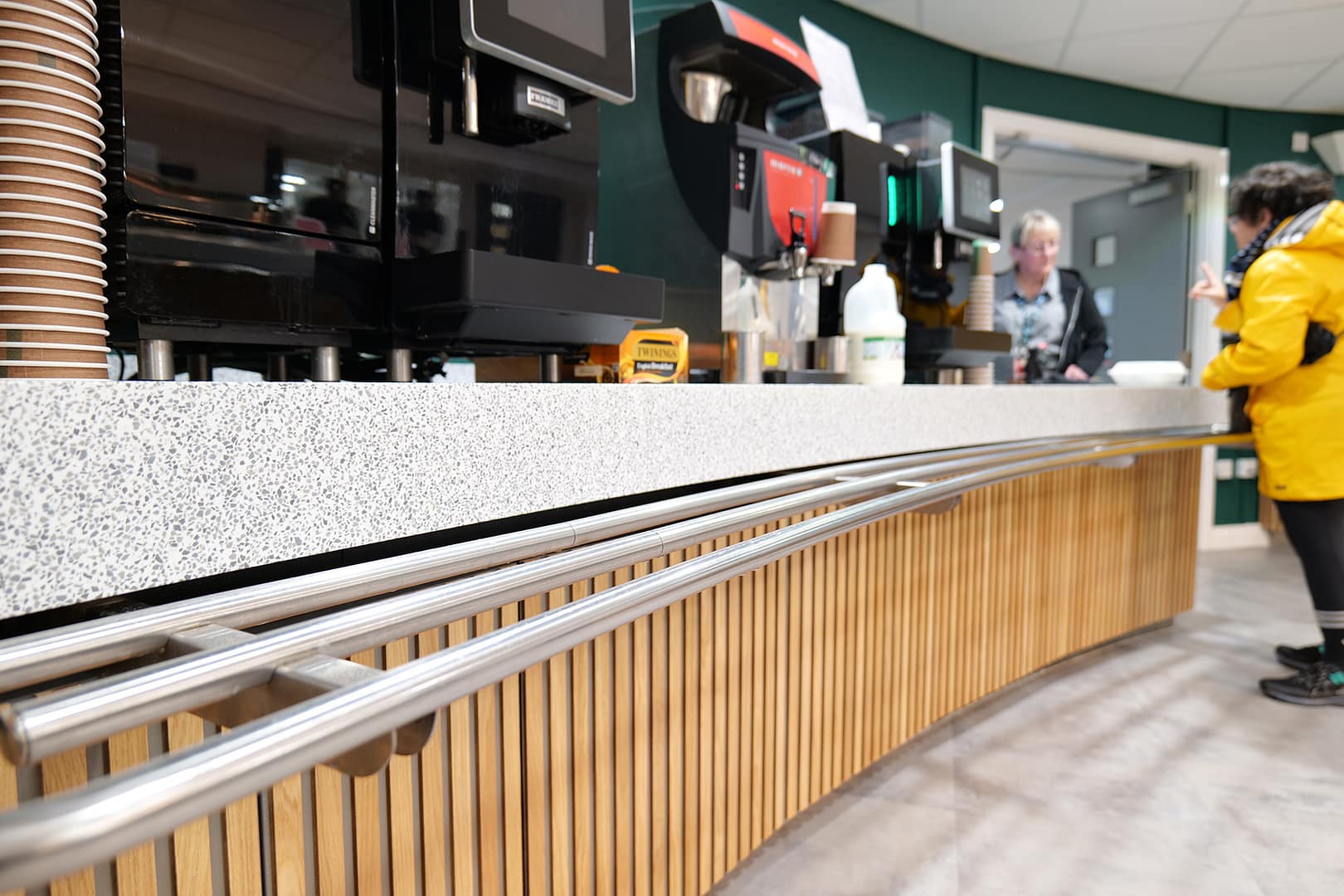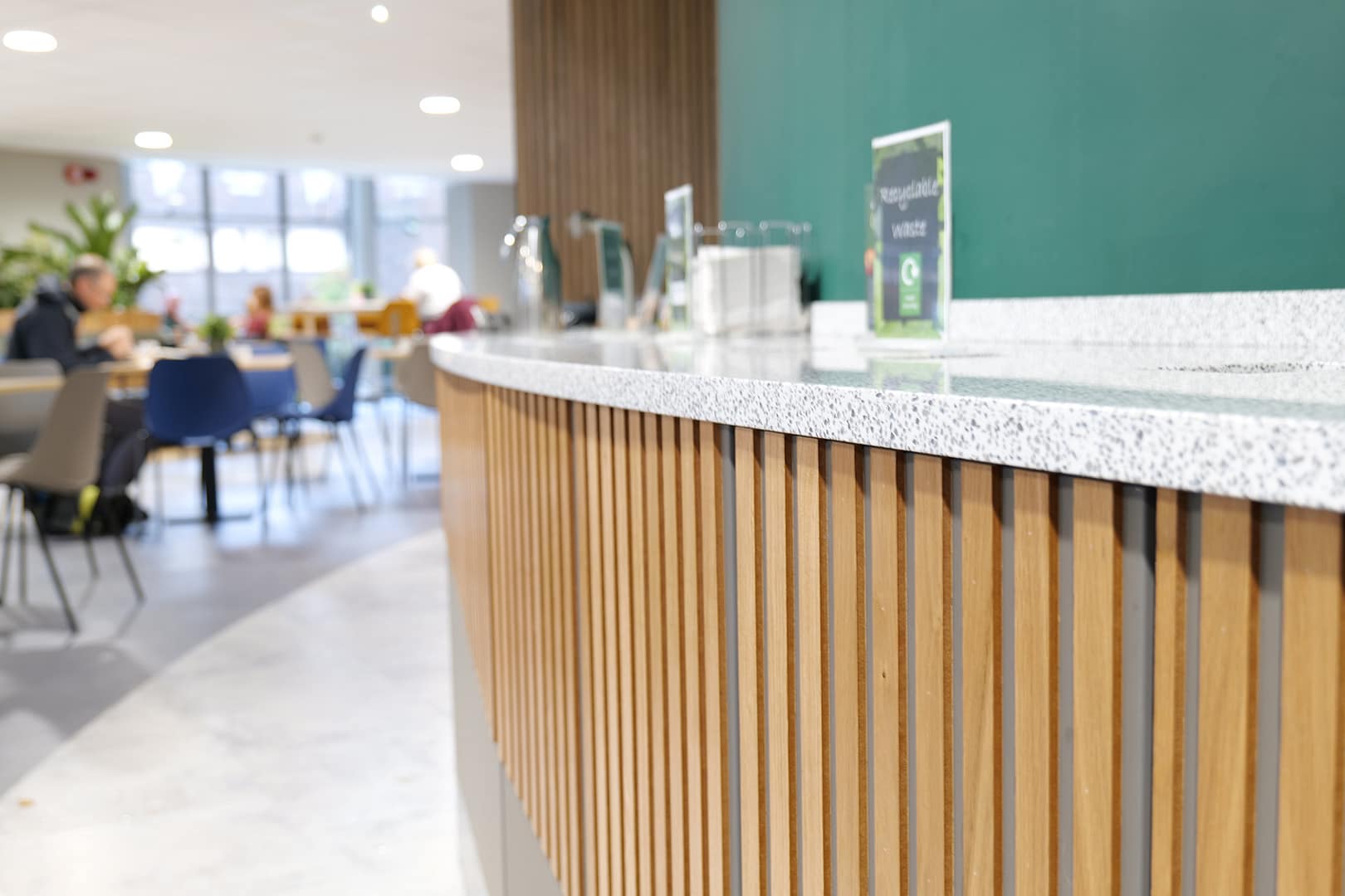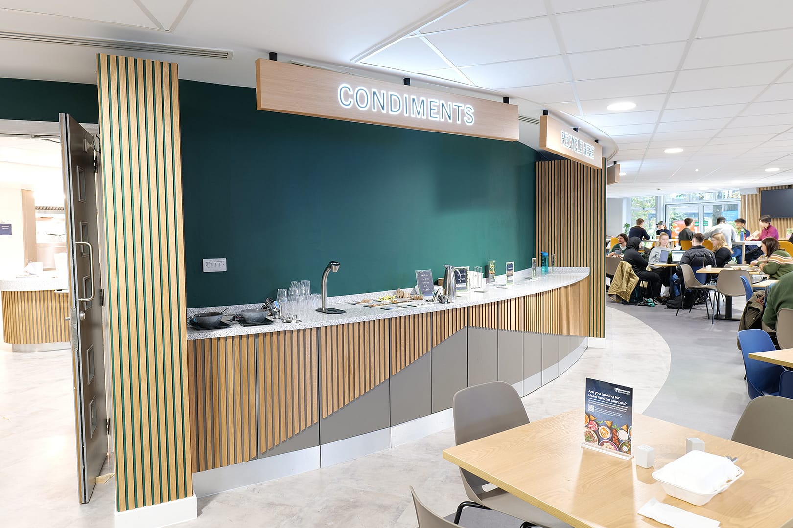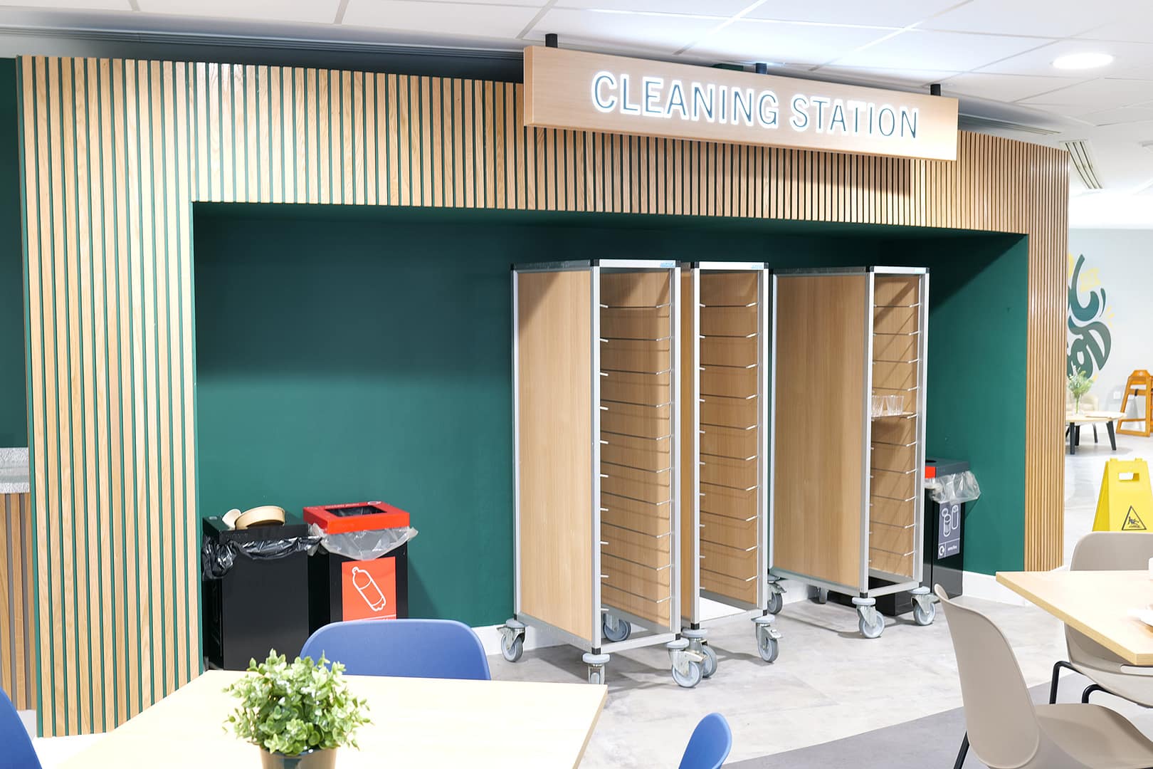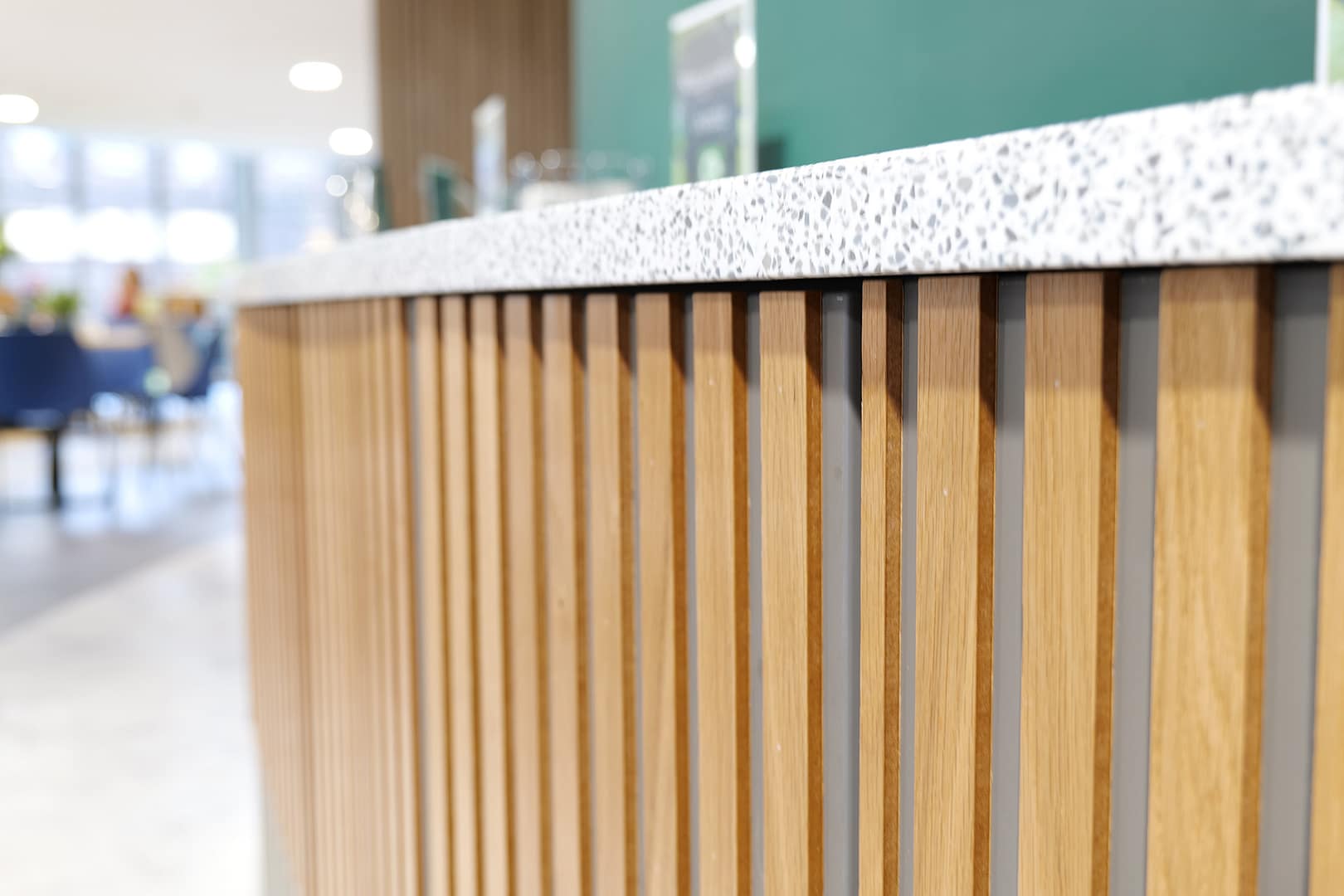Several other areas such as a fridge “grab and go” section, condiment and cleaning areas had hand-made surrounds comprising individual slats of stained and varnished wood which were painstakingly installed by hand.