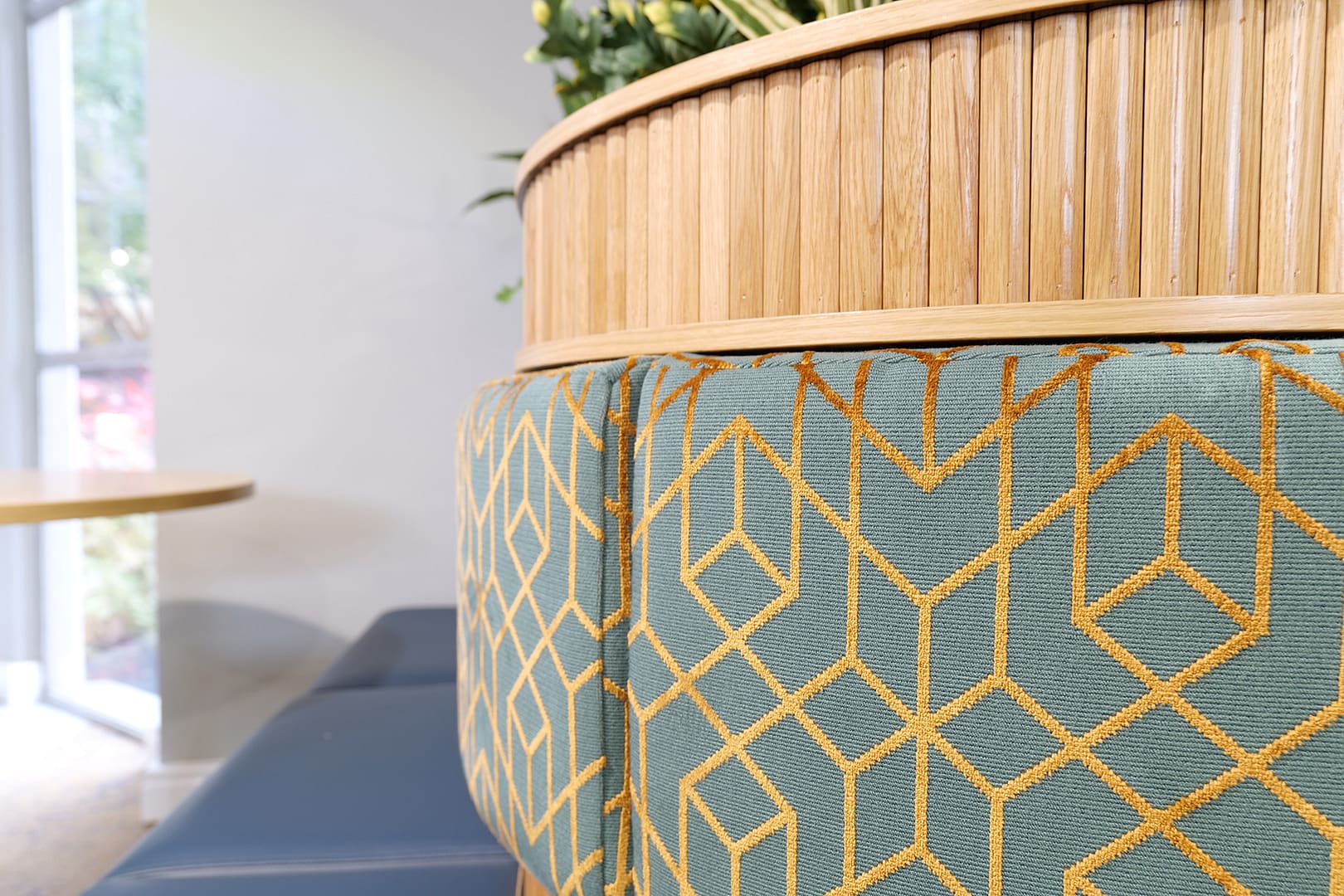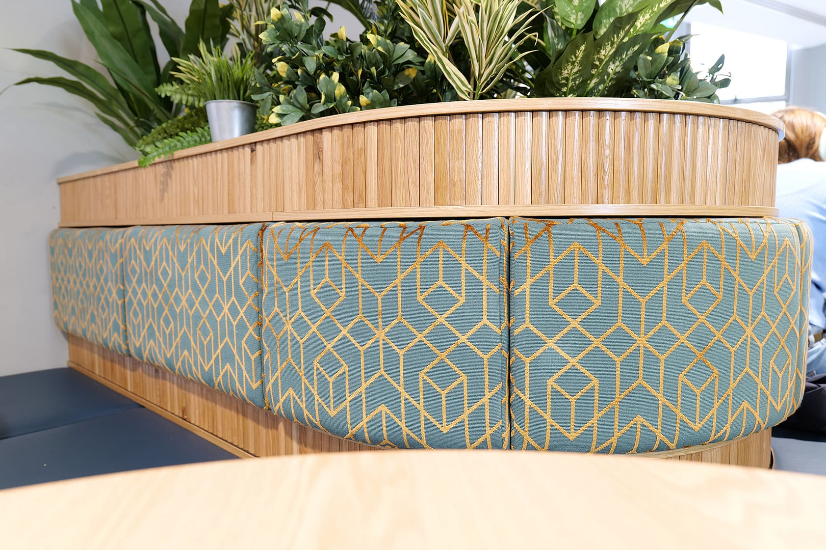 Some unique curved and upholstered seating areas with integral planters also presented a challenge with laminate sheeting that also had to be carefully shaped to fit the contours of the tightly curving seat. Again, individual slats were added to match the surrounding features. The fabulous upholstery work was completed by our friends at Armitage and Wilson and perfectly complements this stunning design.